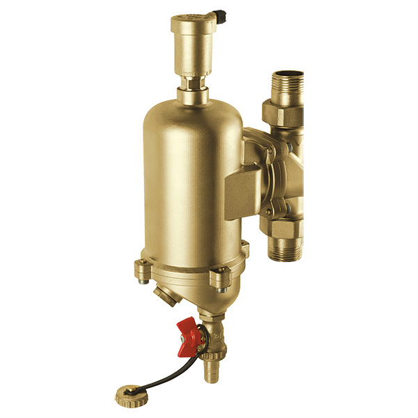 Gehäuse aus entzinkungsbeständigem Messing, mit automatischem Schnellentlüfter mit Rückflussverhinderer, integrierter Magnet zur Abscheidung ferromagnetischer Partikel, am Boden befindlicher Kugelhahn zum Ablassen des abgeschiedenen Schlammes, drehbares Anschlussstück für die Montage in senkrechten als auch waagerechten Leitungsverläufen