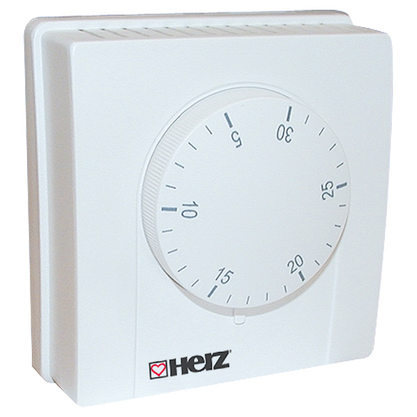 Raumtemperatur-Sollwert analog einstellbar5°C bis 30°C, 230 V~, 50 Hz.Ausgang: 2 oder 3 Kontakt (Wechsler), 230 V~, 10 (3) ASchutzklasse IP 30.