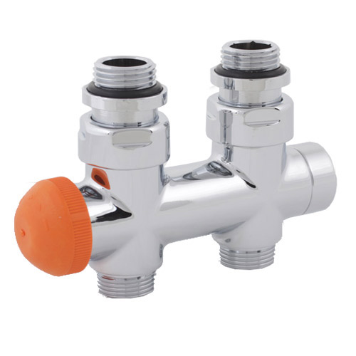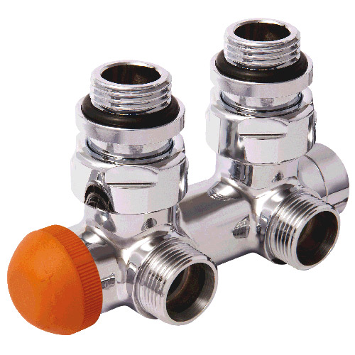 | TS-3000-Eck-1R-Design-Chrom Eckform für Einrohr-Anlagen, Anschlussstutzen- Mittelabstand 50 mm, Heizkörperanschluss G 3/4 mit frei drehender Mutter. Thermostatkopfanschluß - M 28 x 1,5; verchromt. Rohranschluss mit Aussengewinde M 22x1,5 mit Konus für Klemmsetanschluss. Klemmsets sind separat zu bestellen. | 80004 7 | S 3791 41 |